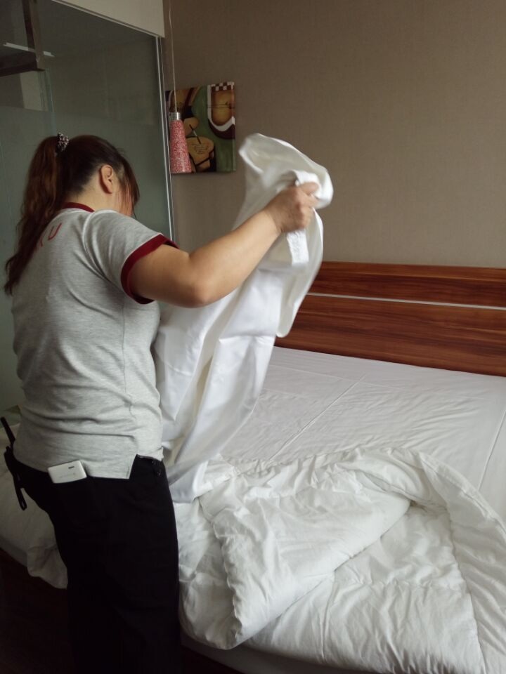 讲解结束后,冯店长把员工们分成了四组,一组员工在前厅学习PMS前台管理系统、对客服务流程等:另外三组员工分别由三位客房服务员带领在客房学习做床,保洁等工作。酒店的专业人员首先为员工演示操作流程,然后让员工们练习做床的步骤,酒店的专业人员从旁指导,使员工的实操能力增强,把书本上学到的理论知识应用到了实践中,实现了公司课程和酒店岗位的全面融合。