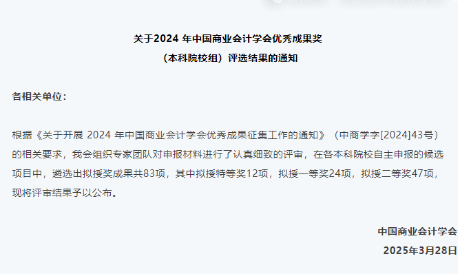近日,在中国商业会计学会举办的2024年本科院校会计教学类教学成果奖项评选中,悟空体育王桂荣教学团队在公司的大力支持下,凭借多年积累的课程教学改革与实践经验,荣获优秀教学成果奖二等奖。