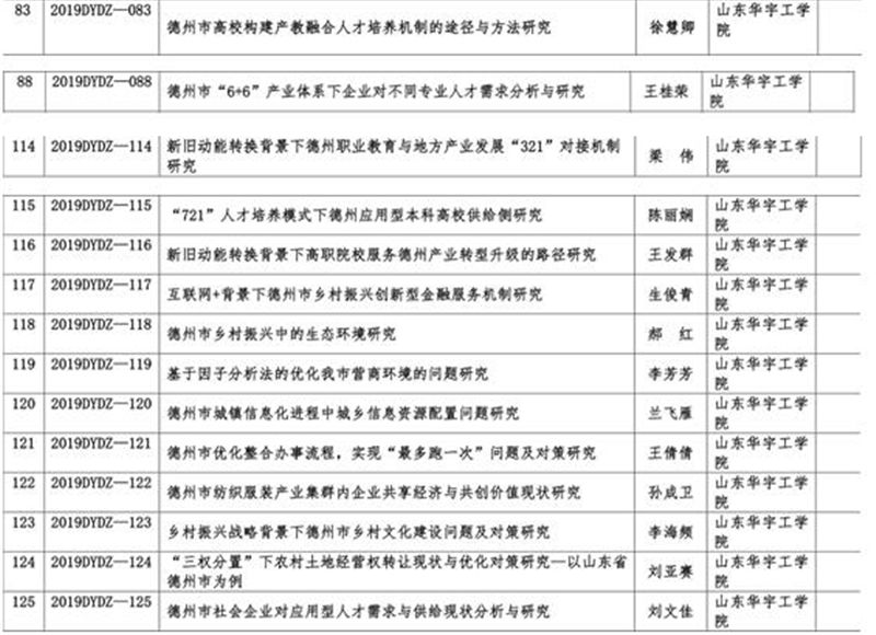 在本次获批立项的14项“调研德州”活动课题中,徐慧卿老师主持的课题《德州市高校构建产教融合人才培养机制的途径与方法研究》、王桂荣老师主持的《德州市“ 6+6 ”产业体系下企业对不同专业人才需求分析与研究》、生俊青老师主持的《互联网+ + 背景下德州市乡村振兴创新型金融服务机制研究》等。