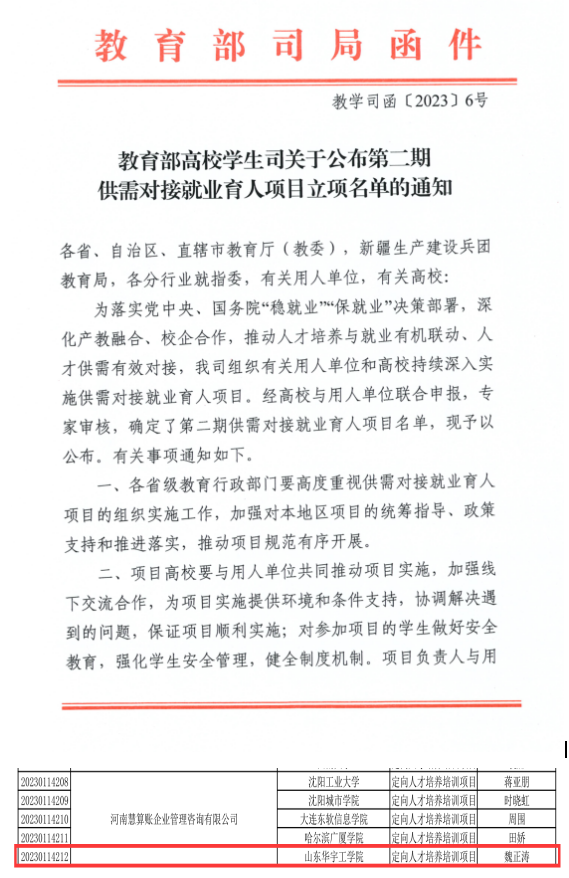 经过精心准备和科学论证,财务管理专业教研室主任魏正涛副教授与河南慧算账企业管理咨询有限公司联合的《职业能力导向下校企协同育人路径研究》项目,成功立项教育部第二期供需对接就业育人项目。该项目是公司全面落实公司“员工中心、需求导向、全面发展、产教融合”育人理念的重要体现,是公司开展产教融合工作的又一标志,为培养应用型人才与就业一站式服务开辟了创新渠道。