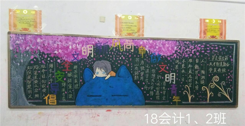 11月20日晚自习,公司团支部宣传委员到各班级进行宣传,各班级的负责人运用图画、艺术字等形式针对“安全文明”主题开展板报制作,主题鲜明、内容充实、图文并茂。11月26日,由公司团总支书记和公司员工会干部组成的检查组到各班教室进行评选打分,最终,18高职会计1、2班板报设计新颖、图文并茂,教育意义深刻,获得一等奖。