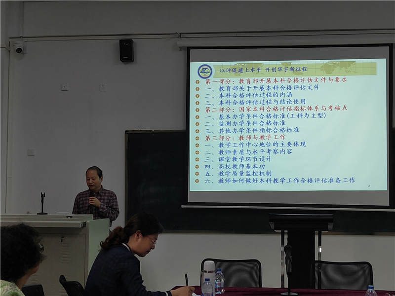 会上,尹子民教授深入浅出的解读了教育部关于开展本科合格评估的文件,简要阐述了本科合格评估的过程以及结论的运用,在此基础上,详细介绍了国家本科评估指标体系及考核点。随后,尹教授重点讲述了教师与教学工作在本科评估工作中的重要地位及作用,就教师如何做好本科教学工作合格评估准备工作进行了探讨。他指出,做好以评促建工作,公司要在以下五个方面下足功夫:一是要体现教学工作的中心地位;二是要加强教师的素质和水平;三是要督促教师好课堂教学各环节设计;四是要扎实推进教师教学基本功训练;五是要完善教学质量监控机制。