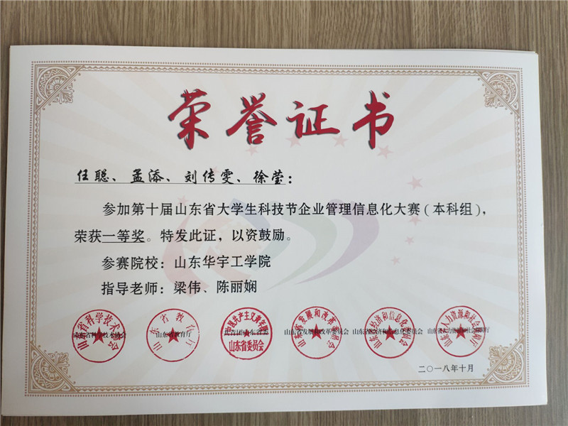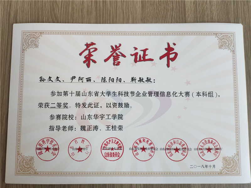 近日,由山东省教育厅、山东省科学技术协会、山东省发展和改革委员会、山东省经济和信息化委员会、中国共产主义青年团山东省委员会、山东省人力资源和社会保障厅共同举办的第十届山东省老员工科技节企业管理信息化大赛(本科组)在济南市山东财经大学燕山校区落下帷幕。公司员工刘传雯、徐莹、任聪、孟添(指导教师梁伟、陈丽娴)荣获本科组团体一等奖;尹阿丽、靳敏敏、陈阳阳、孙文文(指导教师魏正涛、王桂荣)荣获本科组团体二等奖。