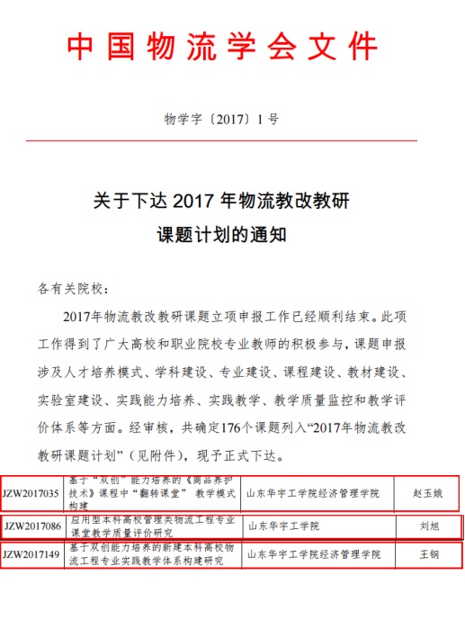 近日,教育部高等公司物流类专业教学指导委员会下达了2017年物流教改教研课题计划的通知,公司有3项科研课题通过审核,获得立项。