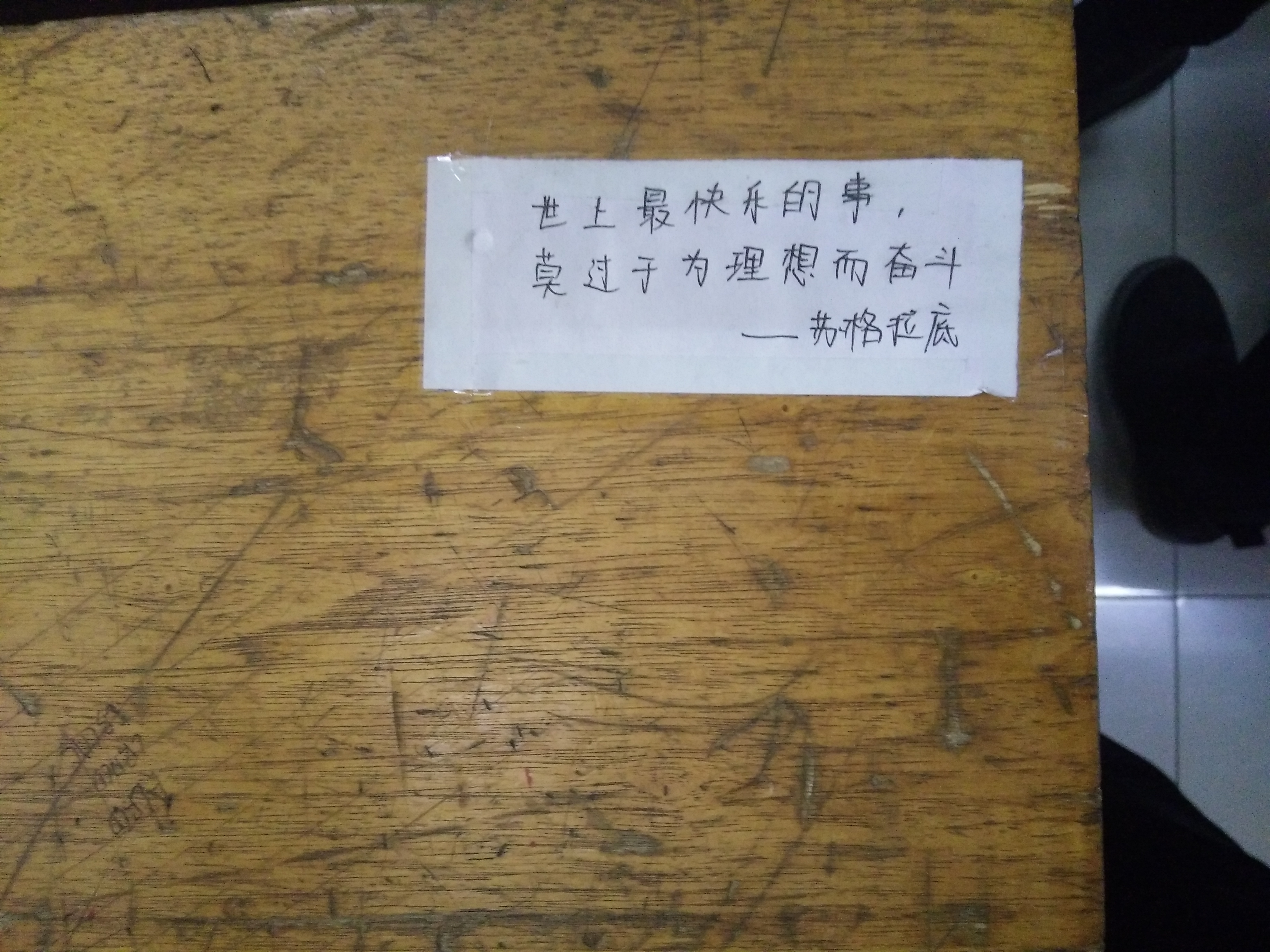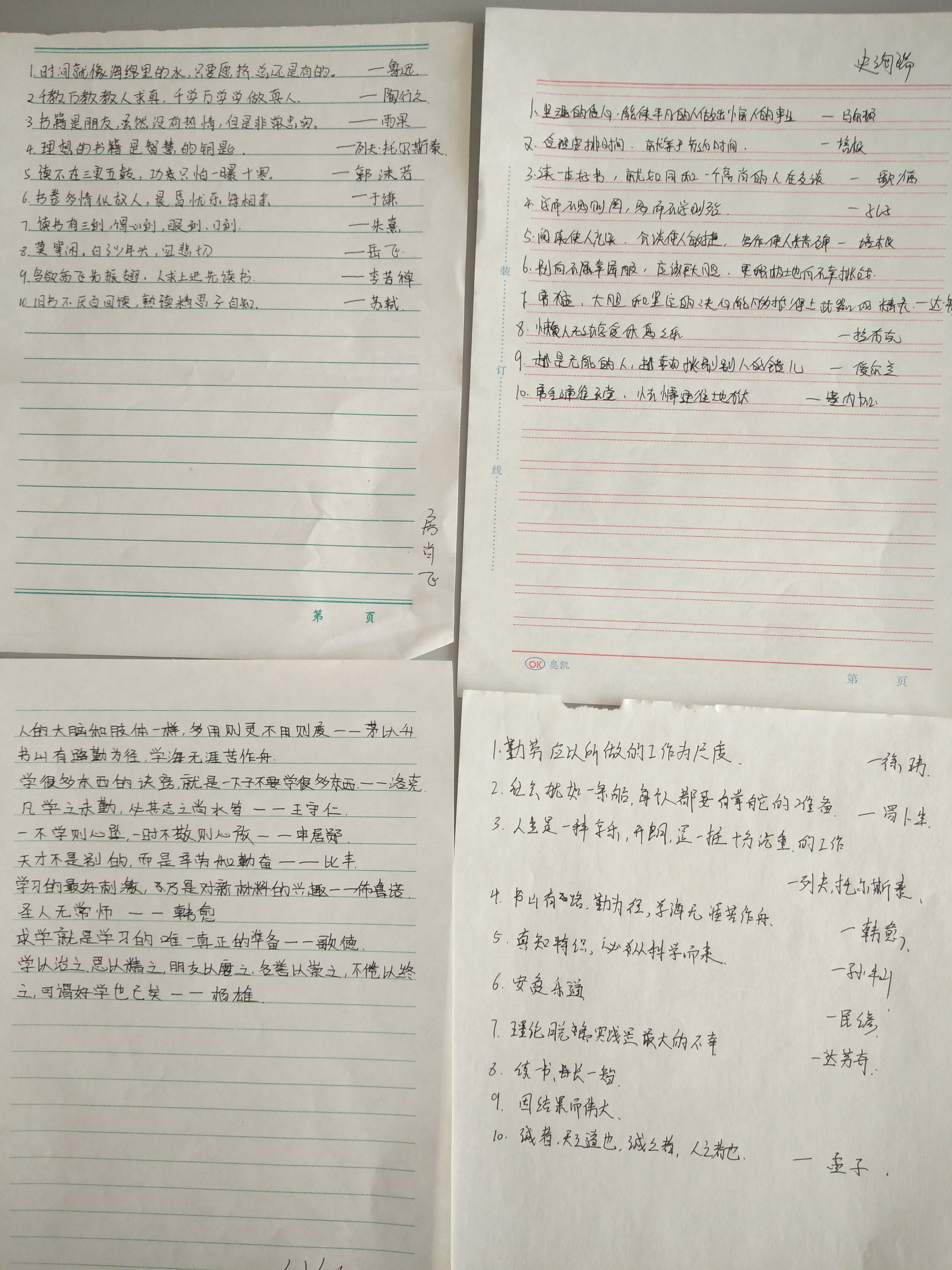 为认真贯彻落实《悟空体育关于加强教风学风建设工作的意见》和《悟空体育2016年教风学风建设月实施方案》的要求,全面推进学风建设工作,不断深化公司“勤奋 扎实 刻苦 坚毅”的良好学风,经管公司开展摘抄名言警句、活动并将个人信奉的一句名言警句以座右铭的形式张贴在课桌上,时刻督促自己,提醒自己。