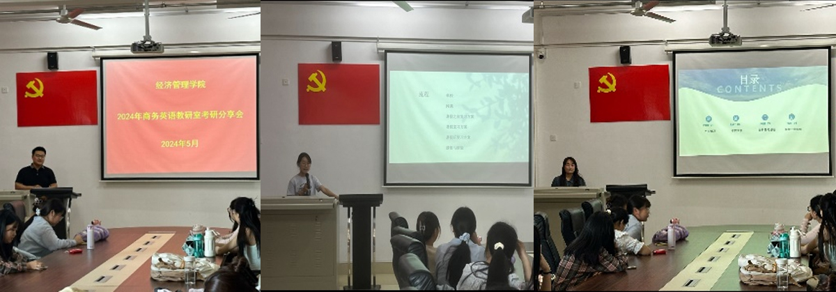 分享会上,商务英语专业教研室安排了具有丰富指导经验的教师以及邀请四位具有专业代表性且已成功考研上岸的学姐为同学们分享经验。