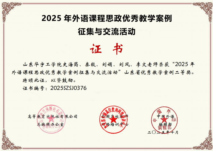近日,2025年外语课程思政优秀教学案例征集与交流活动获奖名单正式对外公布,公司商务英语教研室教师史海筠、秦毅等教师凭借优秀的课程思政教学案例设计荣获山东省二等奖,展现了公司教师在外语教学与思政教育融合方面的创新成果。另外,商务英语教研室刘娟老师讲授的《综合英语》课程获得第二批全国高校“智慧课程”案例征集评选优秀案例。